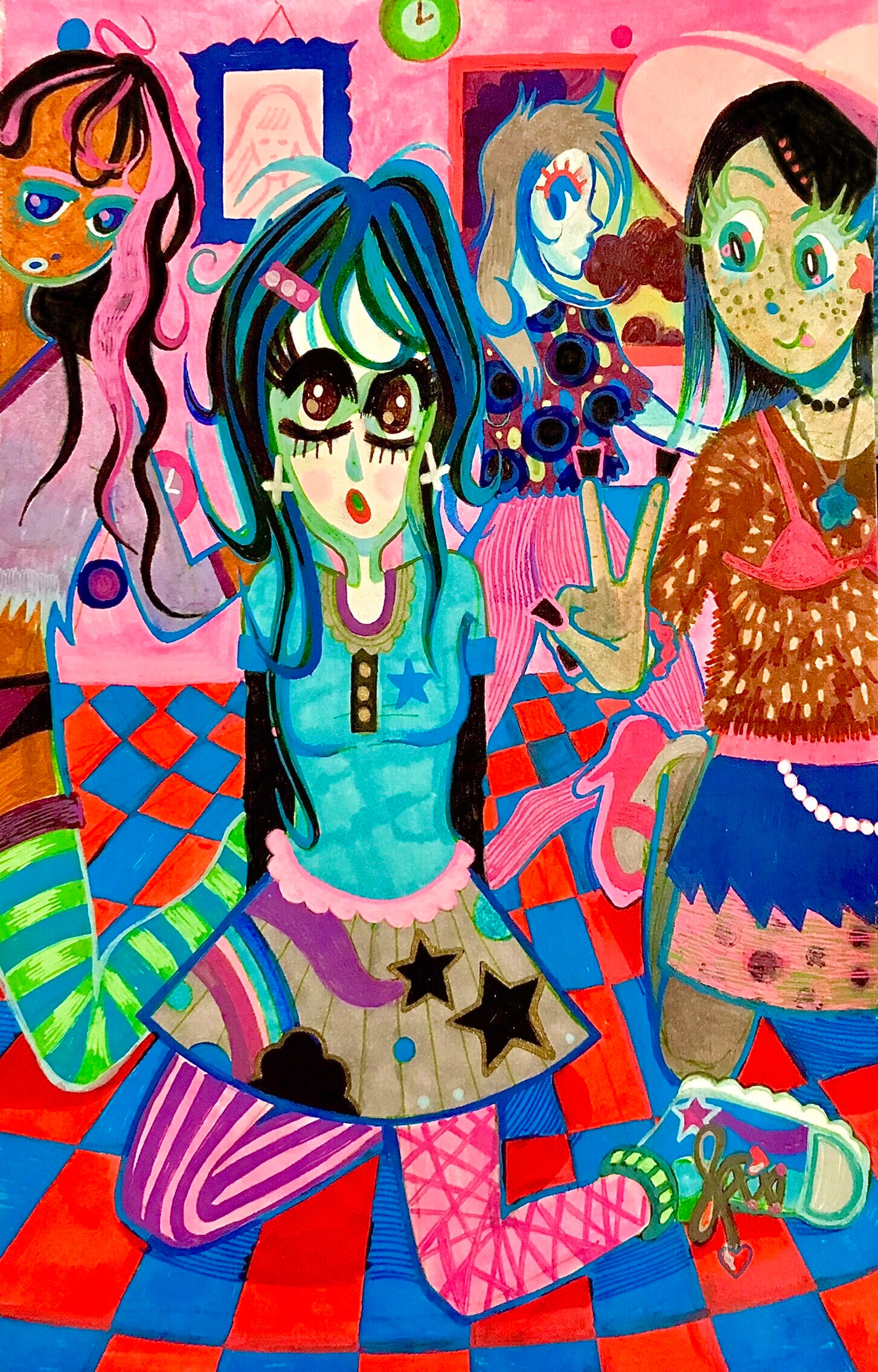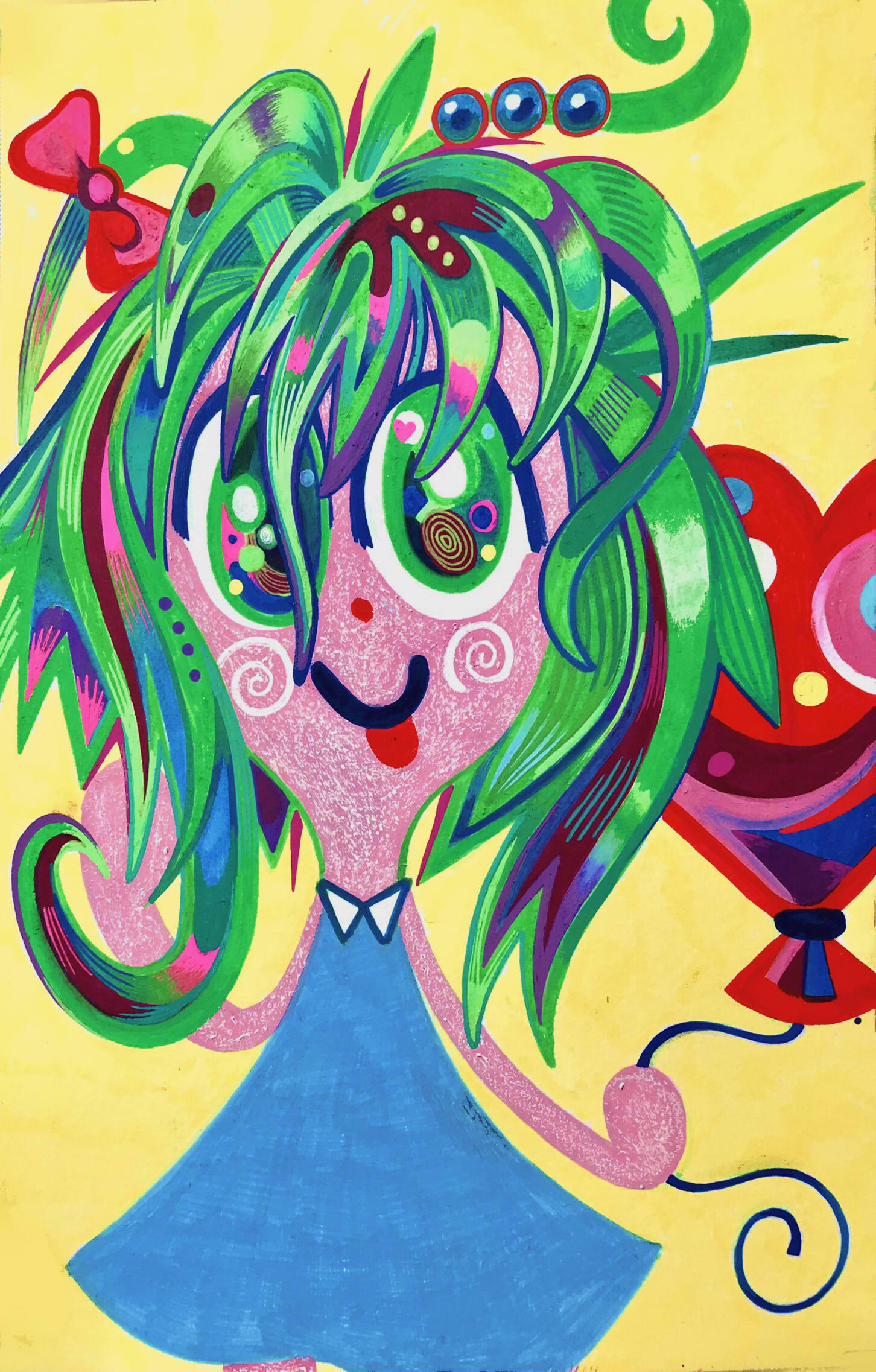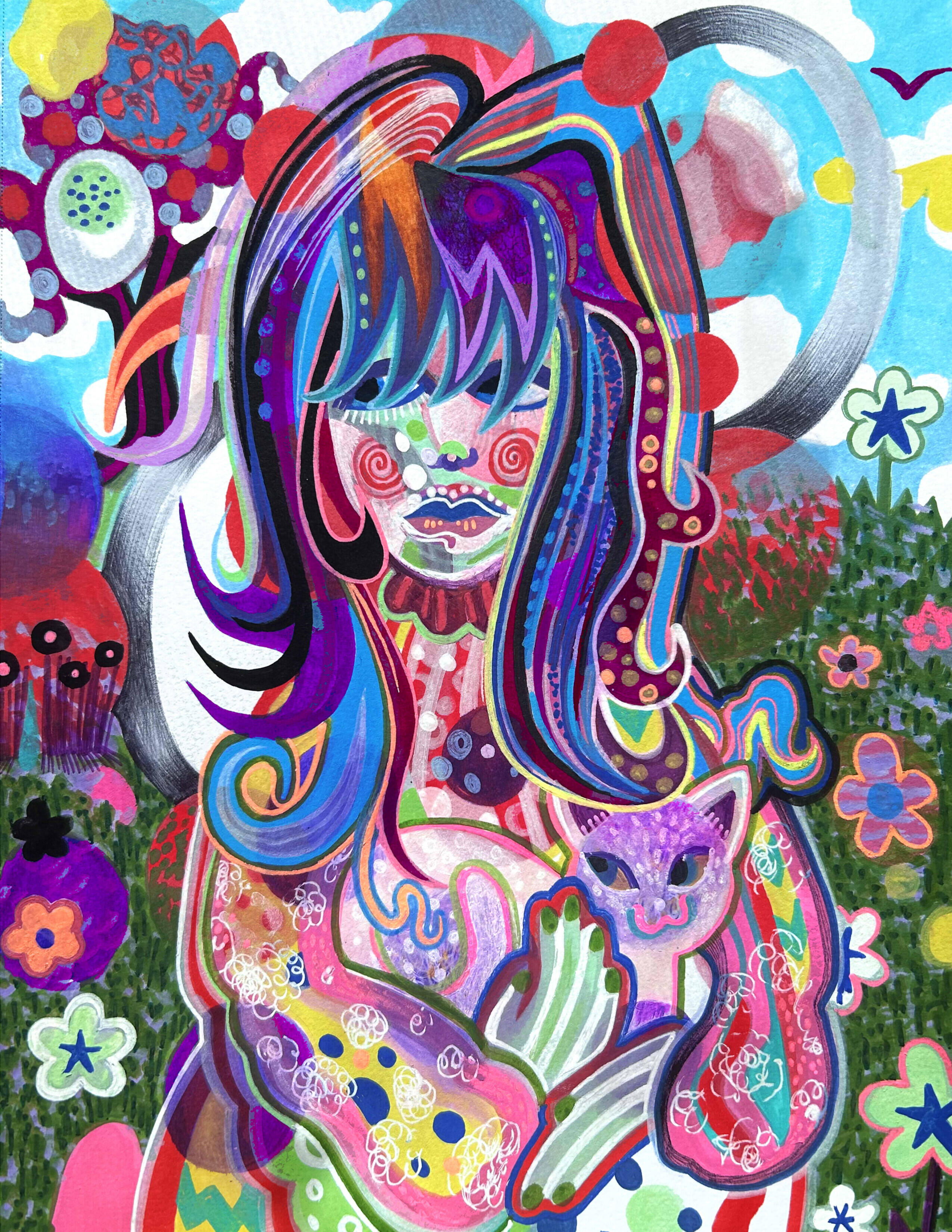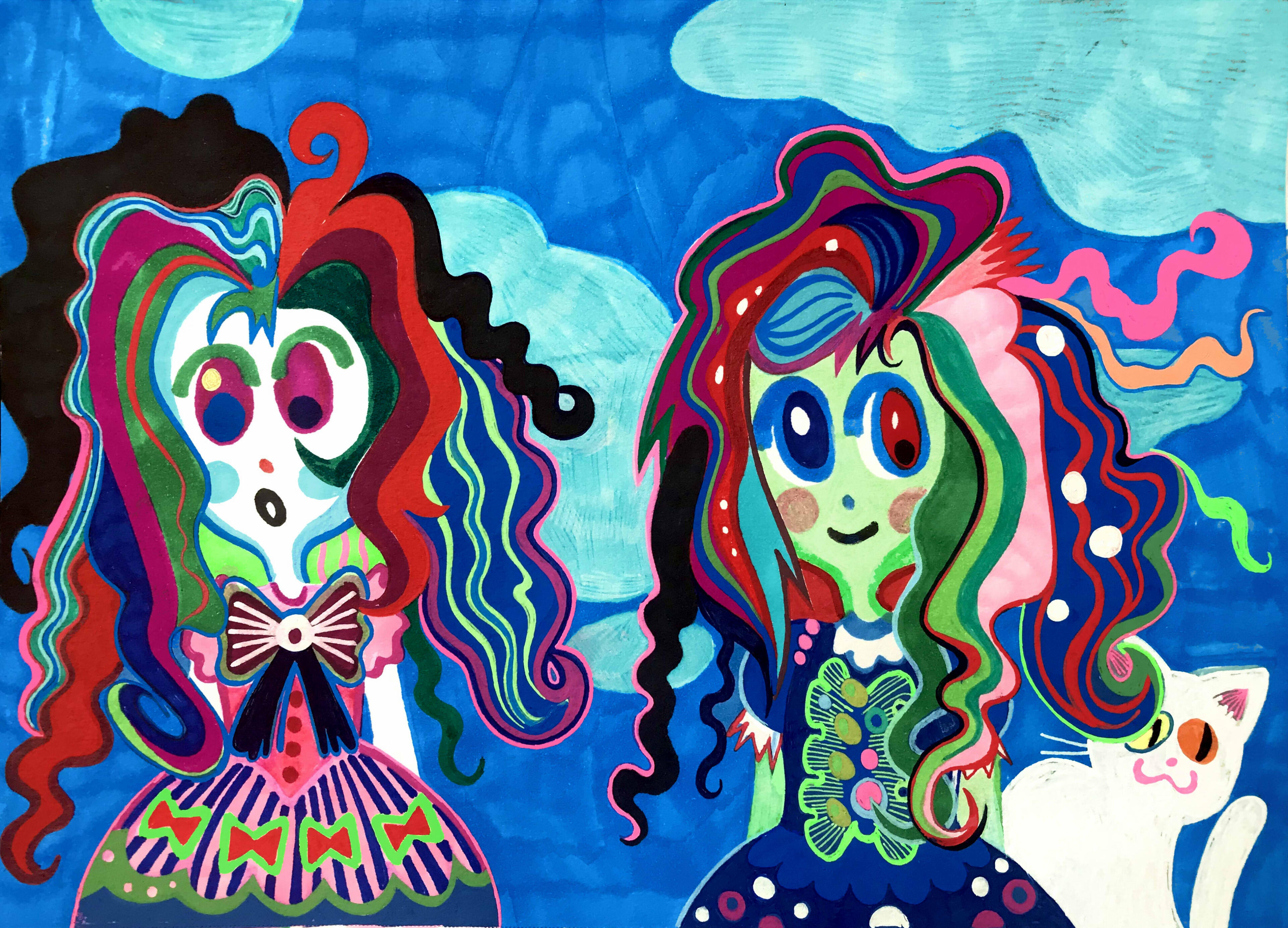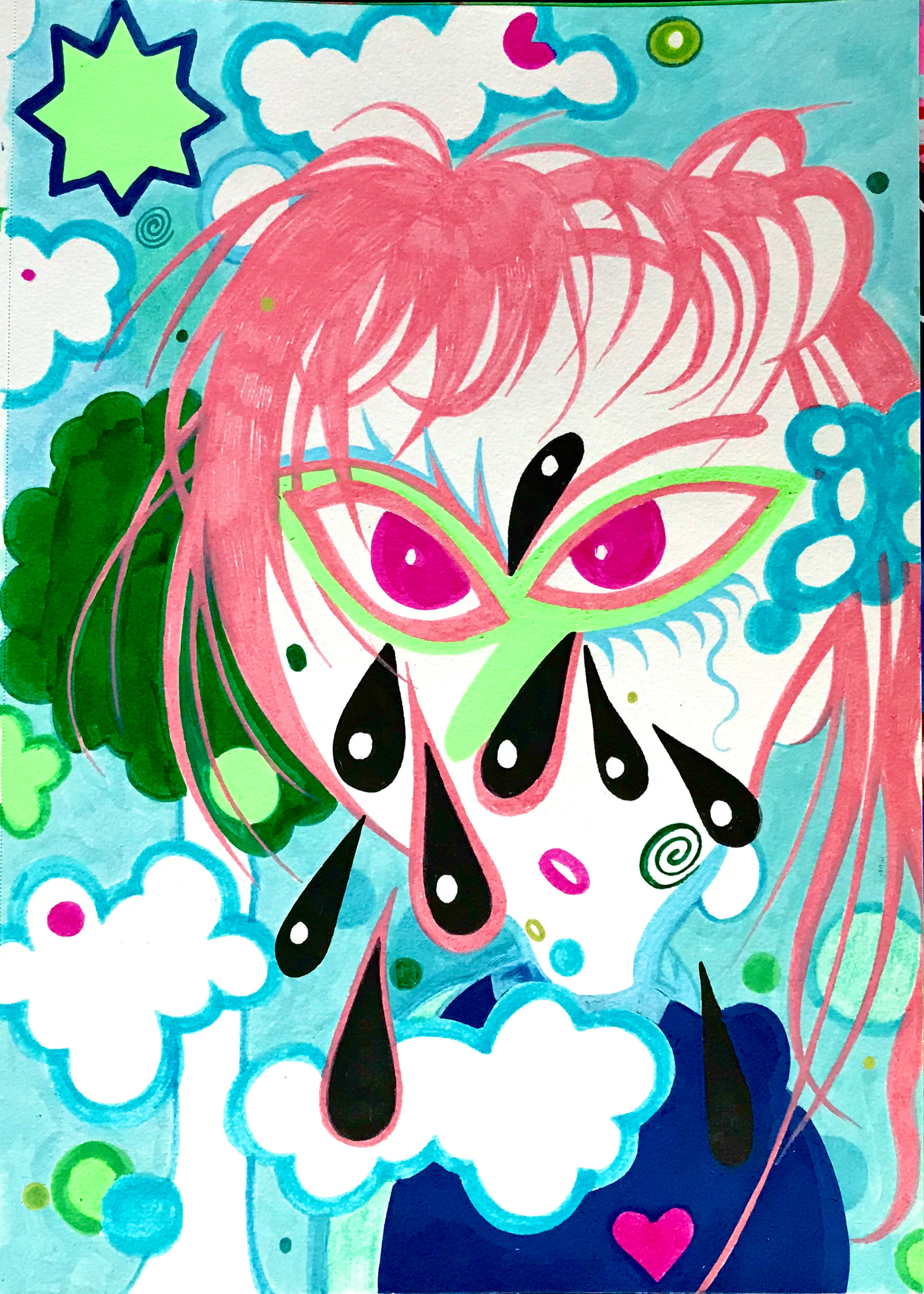 My current style is a result of about a decade of experimentation. Over time, I have experimented with materials such as oil pastels, gouache and acrylic paints, colored pencils, alcohol and water-ink markers, and gel pens (my favorite are gelly roll) to create these pieces. Nowadays I mainly gravitate towards acrylic and ink-based markers as well as gel pens. My work is usually rather small because I draw them in modestly-sized sketchbooks.Some artists that inspire me are si_ku, Aya Takano, ob , Tama, Karla Gerard, and Macato Takahashi