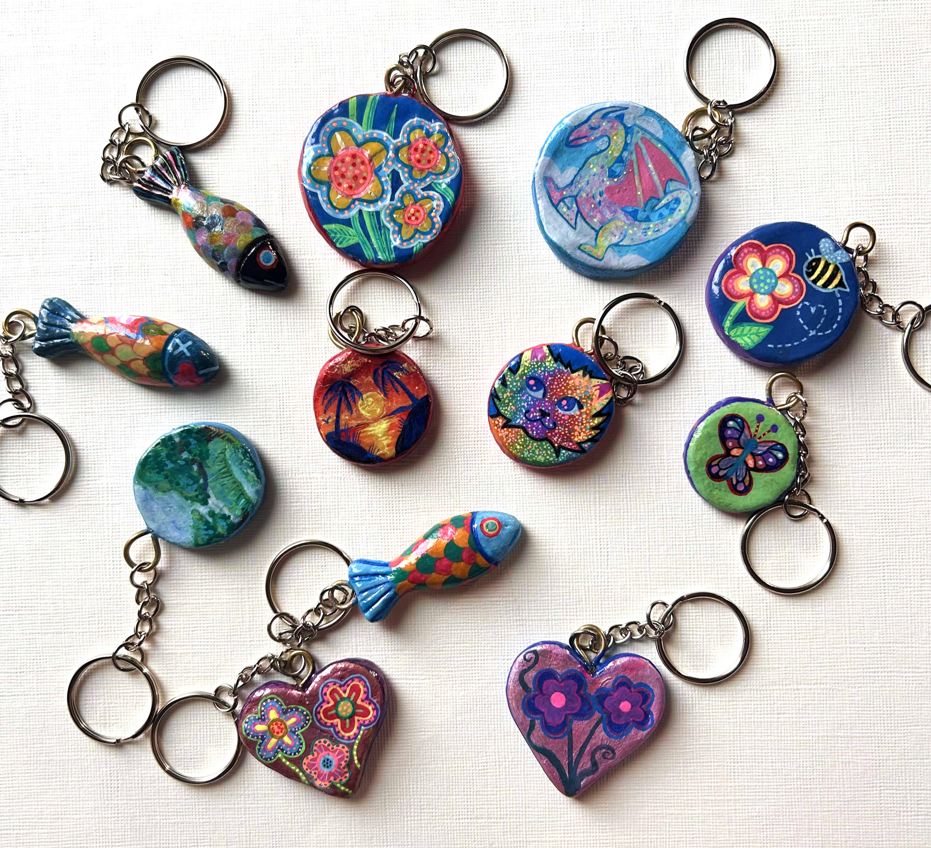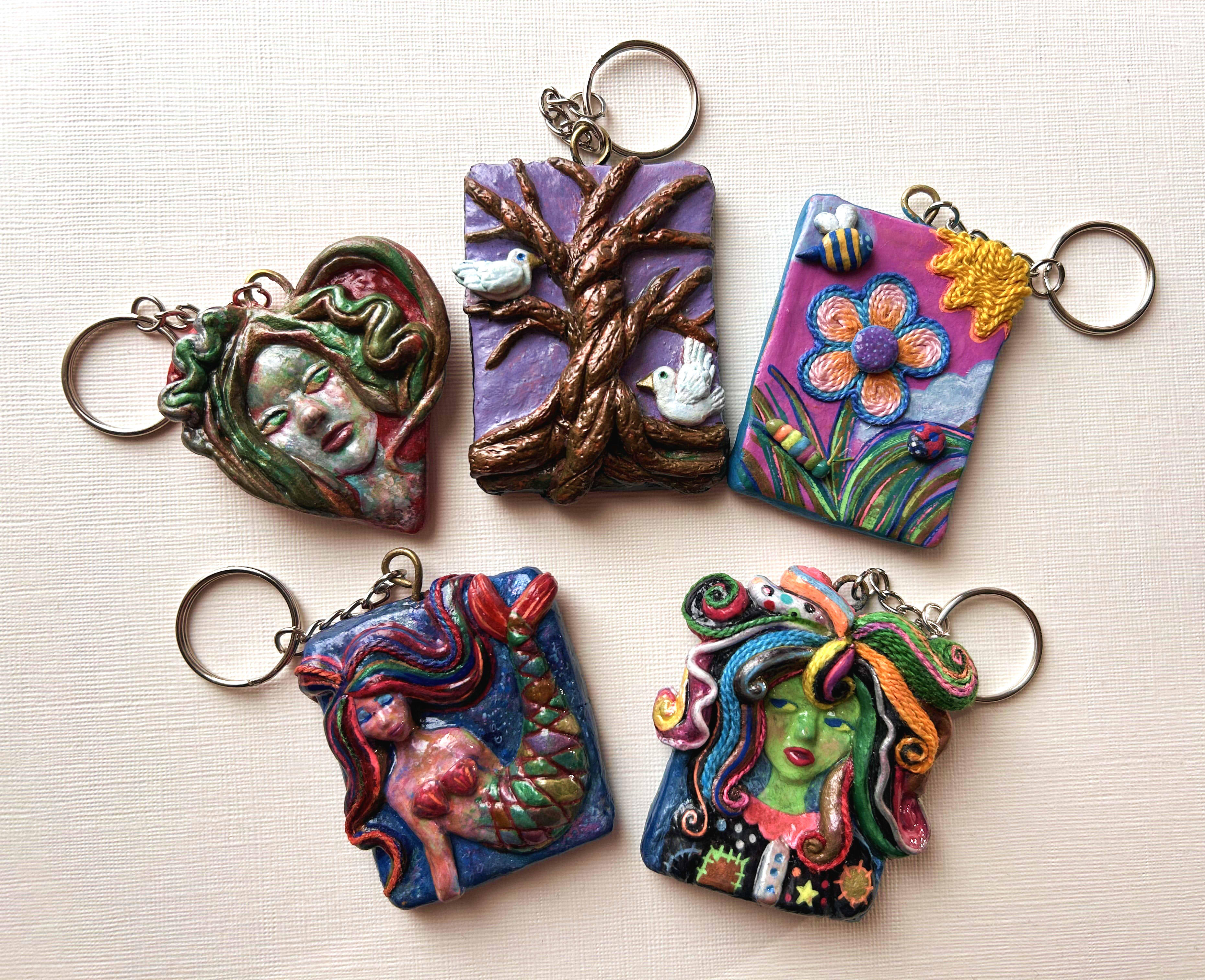 Handmade charms made from air-dry terracotta clay, painted and glazed. These come in many different styles and include human, animal, and flower designs! If you would like a custom keychain, please continue reading.Note: Although "keychain" implies these are only for keys, they can be attached anywhere, such as bags. In fact, some of these are too large/heavy for a set of keys. Please keep this in mind.